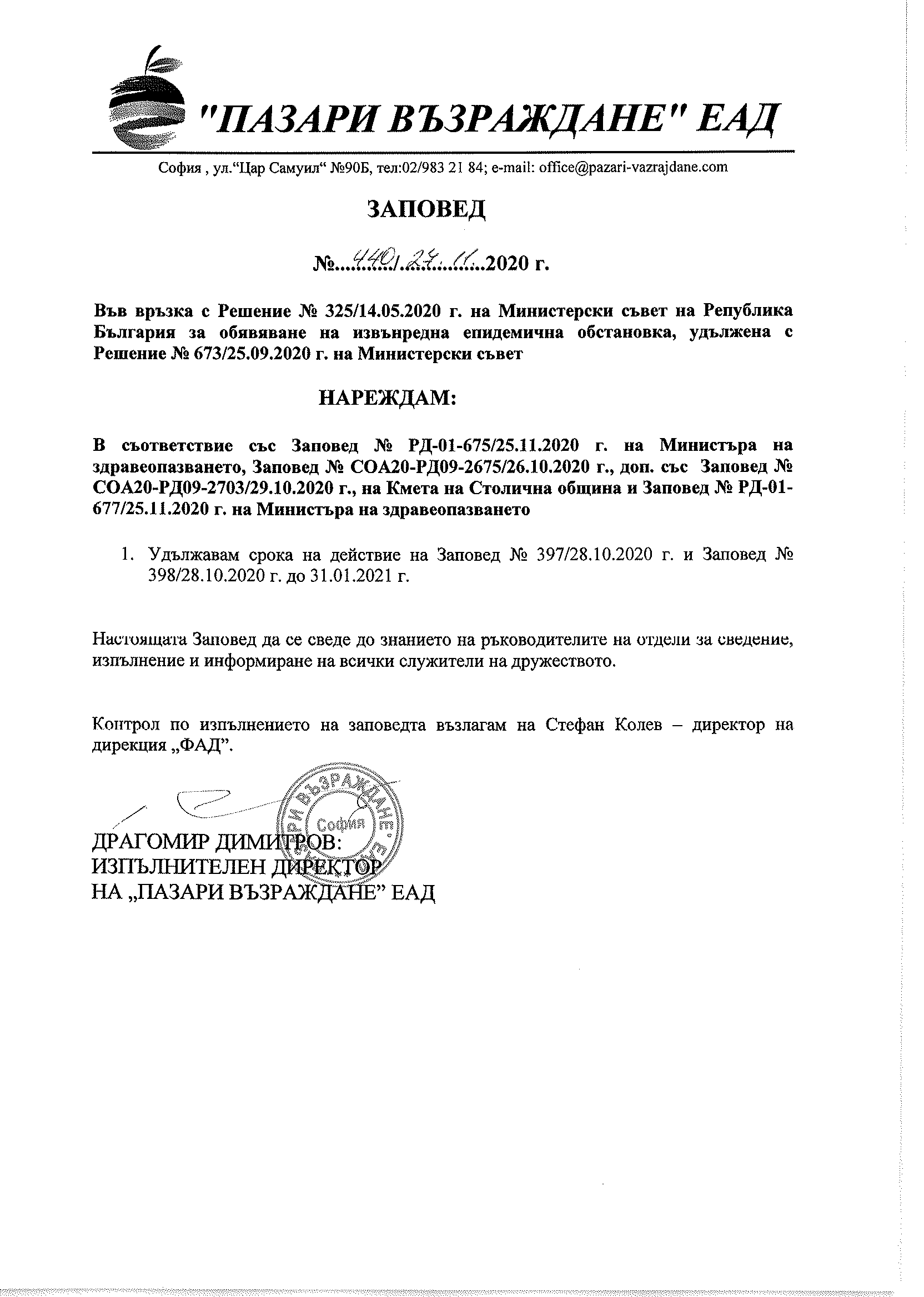 З А П О В Е Д № 440/ 27.11.2020